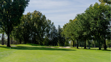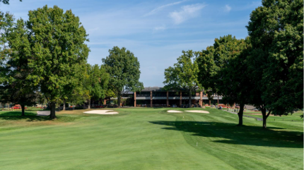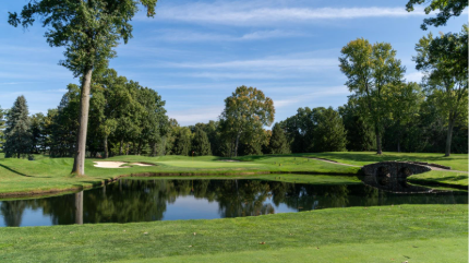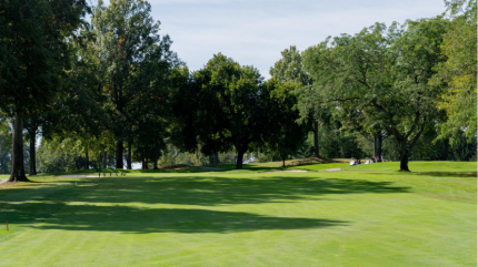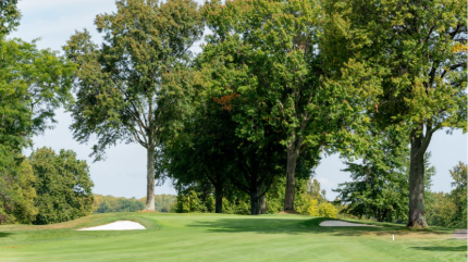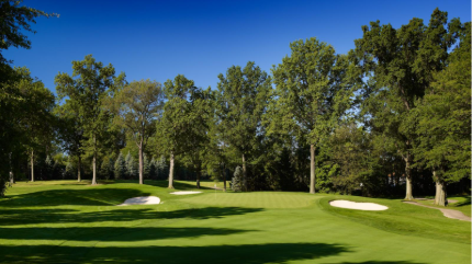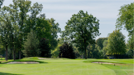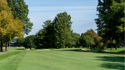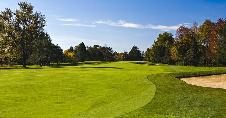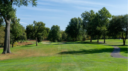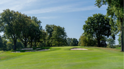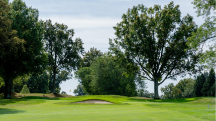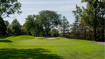 The sixth is a slight dogleg right with a semi-blind tee shot that is one of the tougher holes on the course. The green slopes back-to-front and is surrounded by three bunkers.